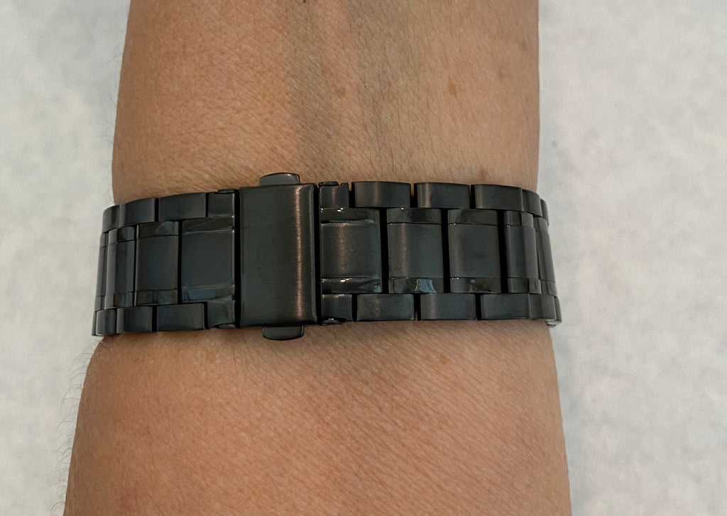 This band is specifically designed to Fit the Apple Watch available for sizes 38mm 40mm 41mm 42mm 44mm 45mm 46mm Series 2-11 SE Ultra 1/2/3 Men's & Women's Black Apple Watch Band Stainless Steel in a new Ultra thin and light design with a butterfly buckle. Can be adjusted to fit wrist sizes from 5" to 8 1/4". Easy to resize and comes with a tool/instructions. You can select the set band+bezel, band only or bezel cover only using the drop down menus.