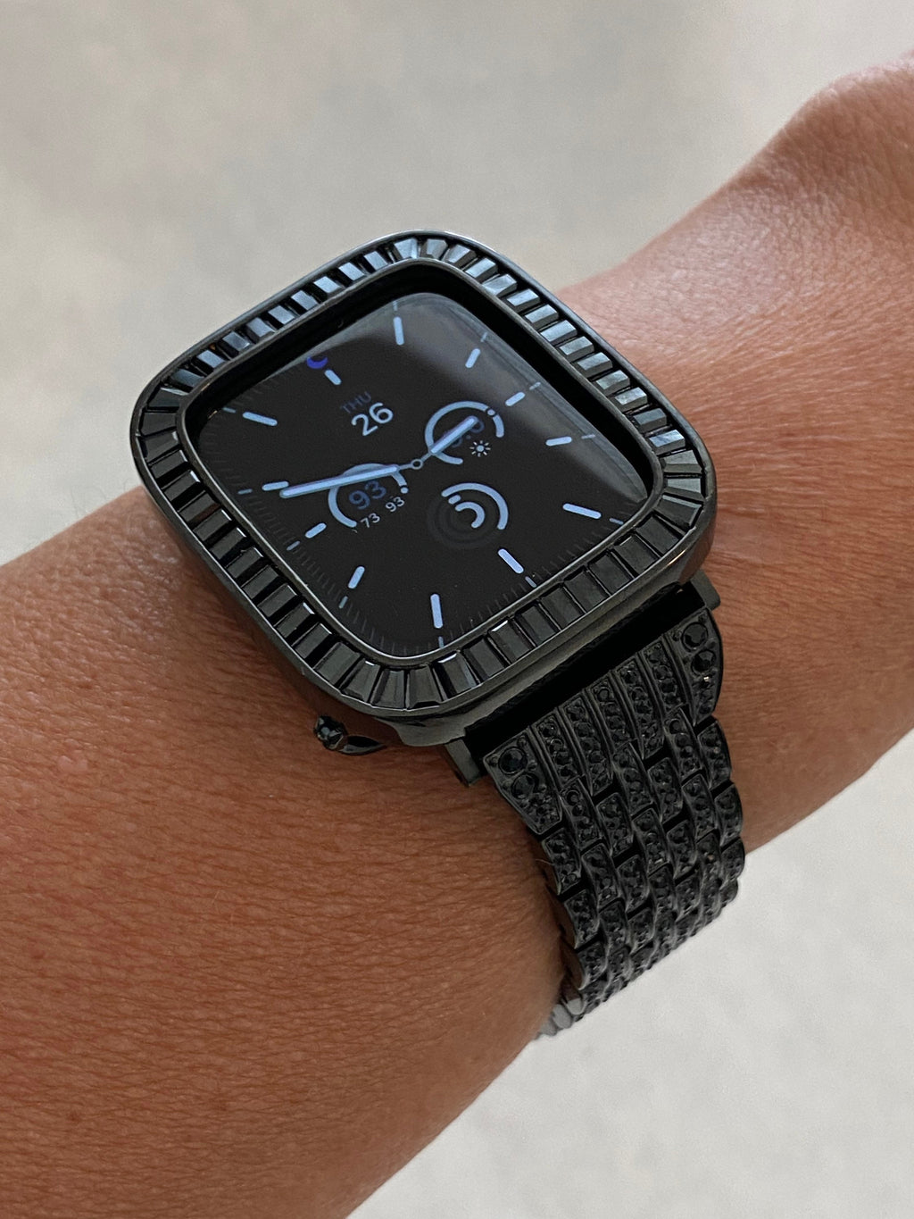 Apple Watch Case Materials: Black Rhodium plating over a metal base with hand set black pave lab created diamonds. Two bars on the back hold the Apple Watch in place with access to all buttons. There is NO screen protector. Instructions Included.