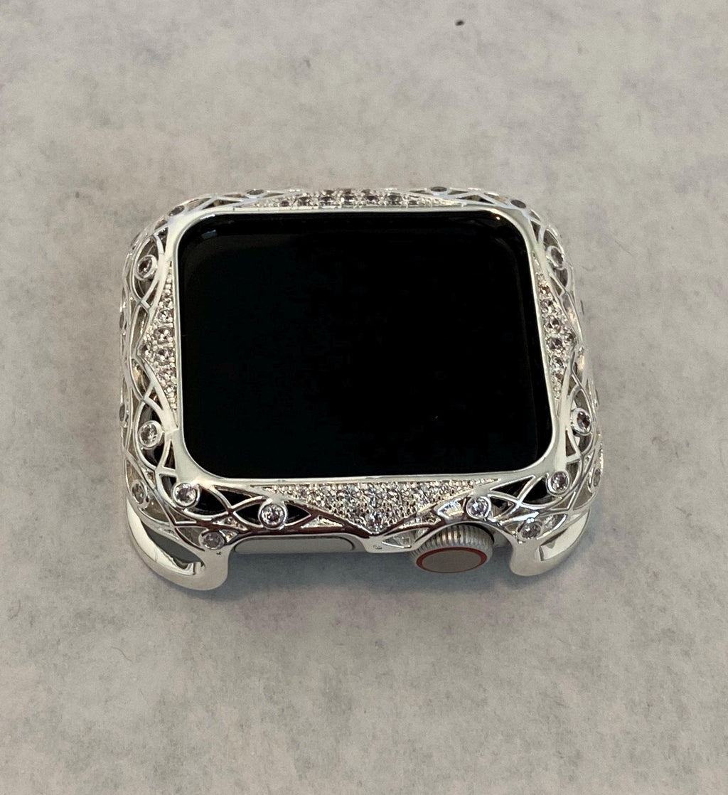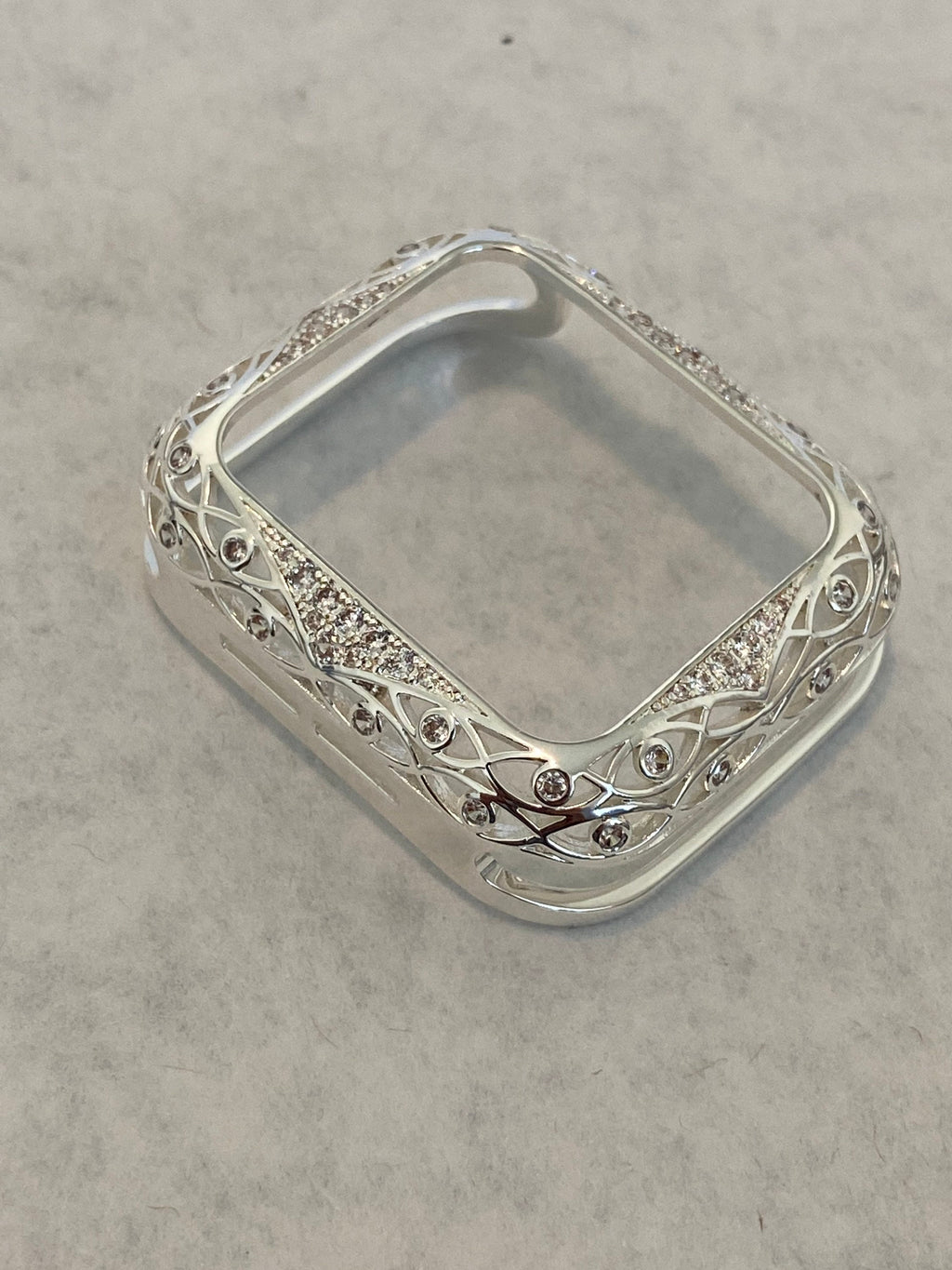Fits the Apple Watch available for sizes 38mm 40mm 41mm 42mm 44mm 45mm 46mm Series 2-10 SE Men's & Women's. Secure inset high quality Swarovski Crystals with pretty lacey design. Fits easily over your watch. Once watch straps are attached it holds the bezel in place. Watchband must be attached for this bezel to fit properly.