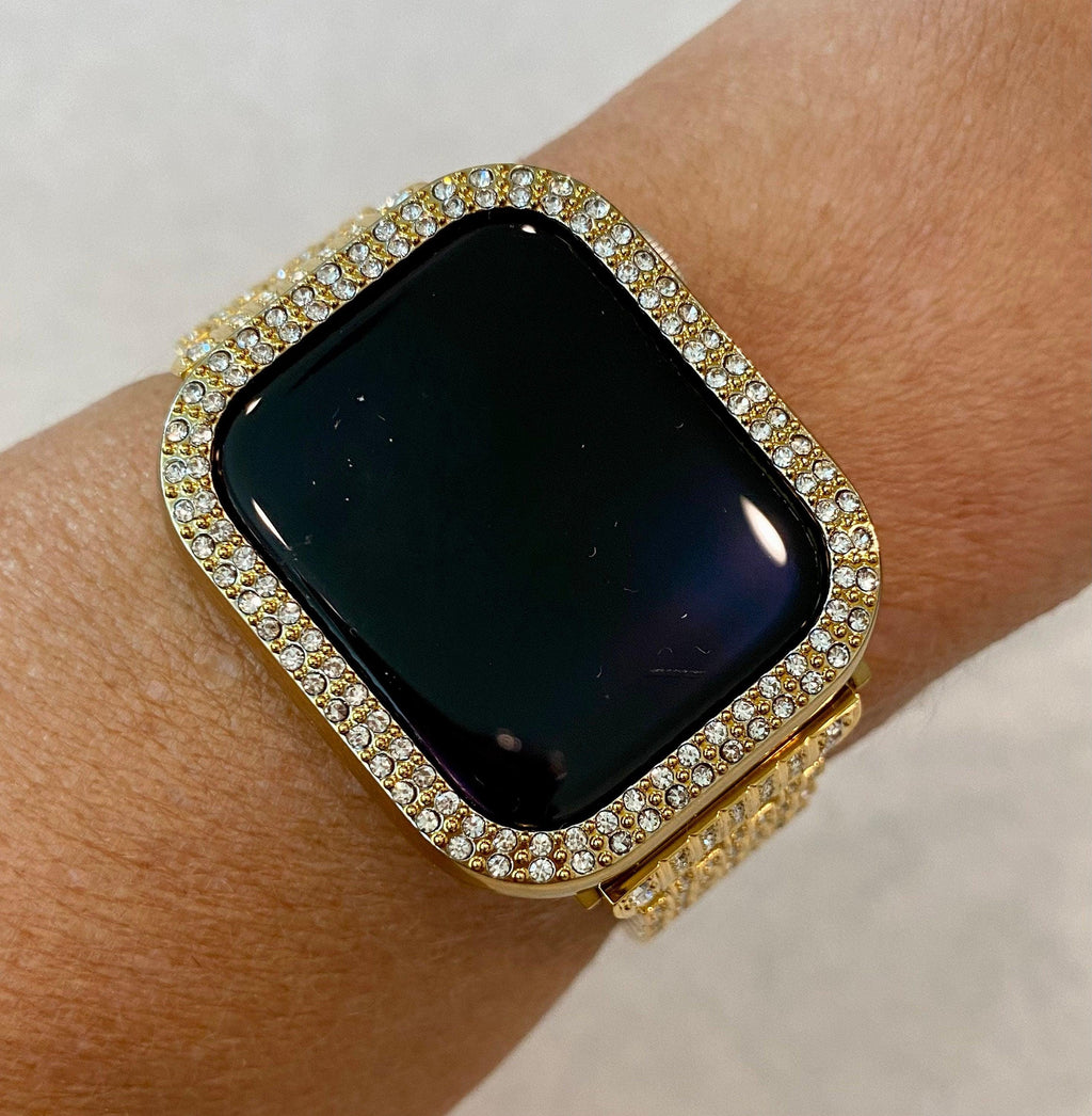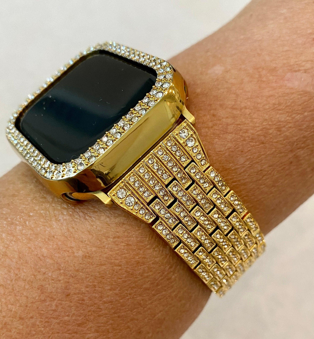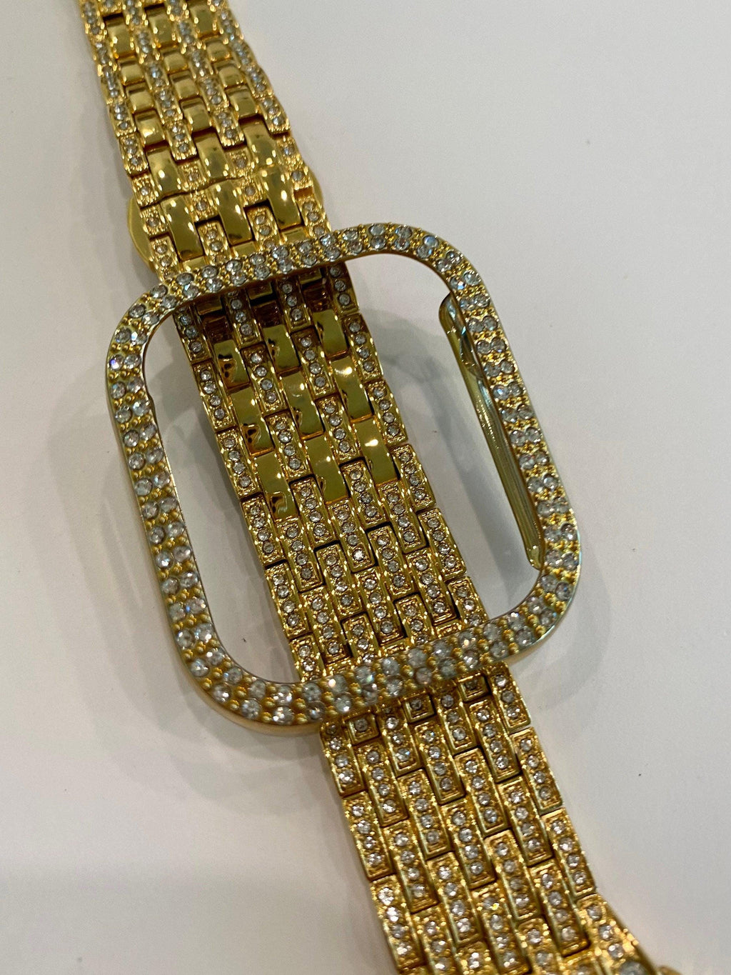 This beautiful Yellow Gold Apple watch band is high on the bling with a plated stainless steel band that features rows of high quality pave Swarovski Crystal rhinestones with a Butterfly Buckle Closure.