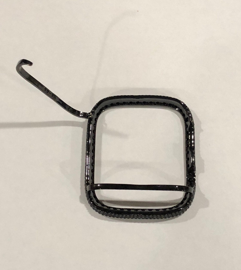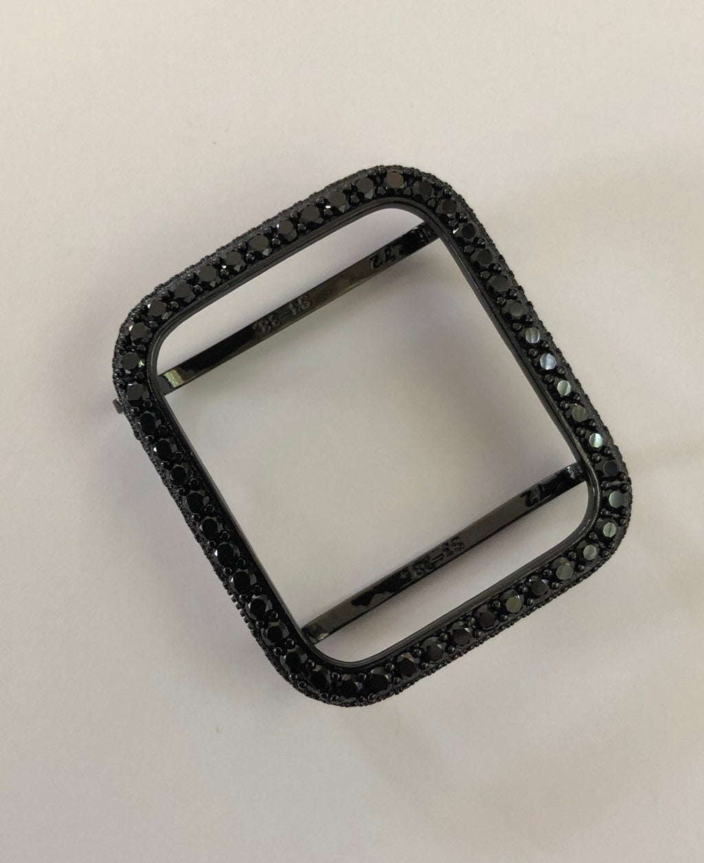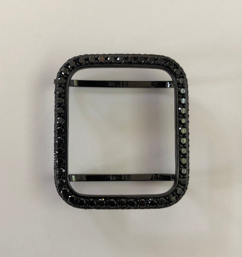 Fits the Apple Watch available for sizes 38mm 40mm 41mm 42mm 44mm 45mm 46mm Series 2-11 SE Ultra 1/2/3 Men's & Women's. Iced Out Apple Watch Cover Black on Black Men's or Women's. Iwatch Band 14k Rhodium Plated Metal Bezel style case cover with Large 2.5mm lab diamonds around the face and micro pave lab diamonds on the sides. Pretty Apple Watch Jewelry. Listing is for bezel only, band in video is not included.