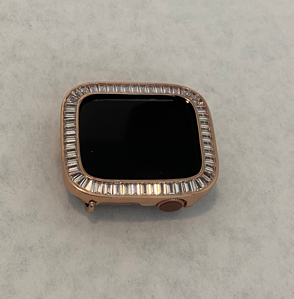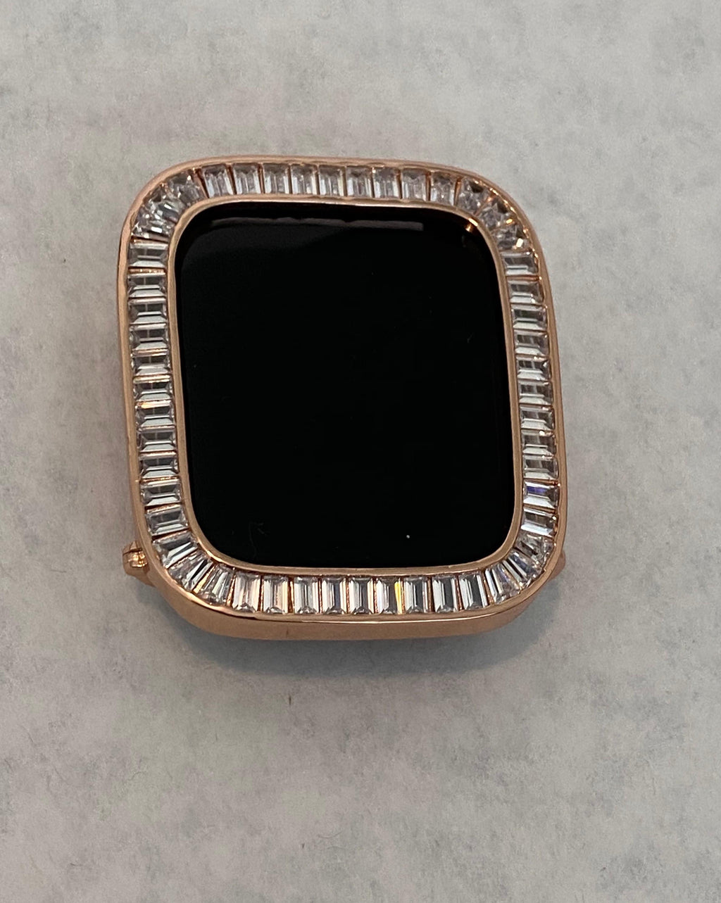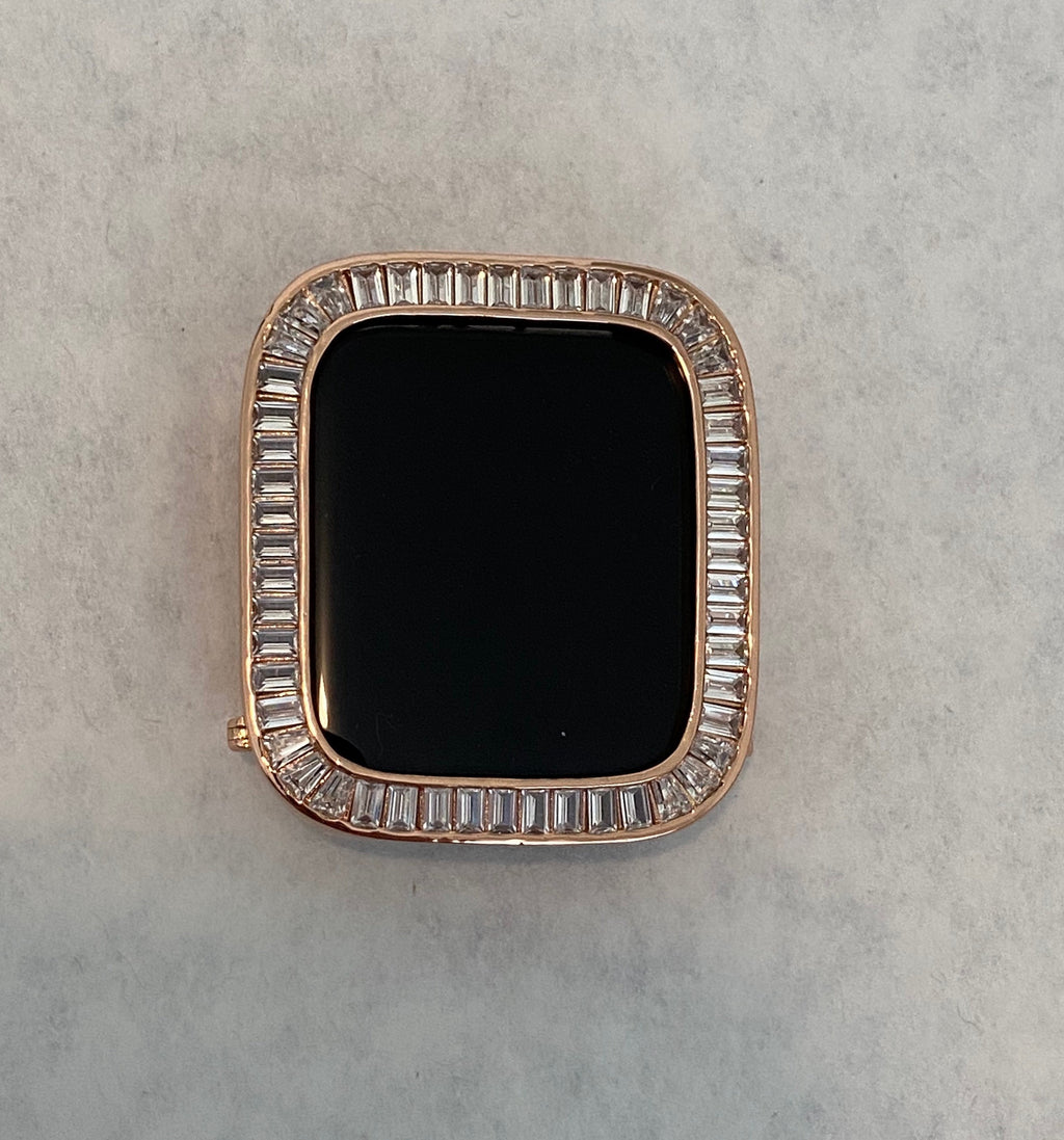 This is a Custom Apple Watch Case from Iwatch Candy with hand set Baguette Lab Diamonds set in 14k rose gold plating. Fits the apple watch sizes 38mm 40mm 41mm 42mm 44mm 45mm Series 2-9 SE. This apple watch case is Custom plated in 14k Rose Gold and set with high quality lab diamonds.