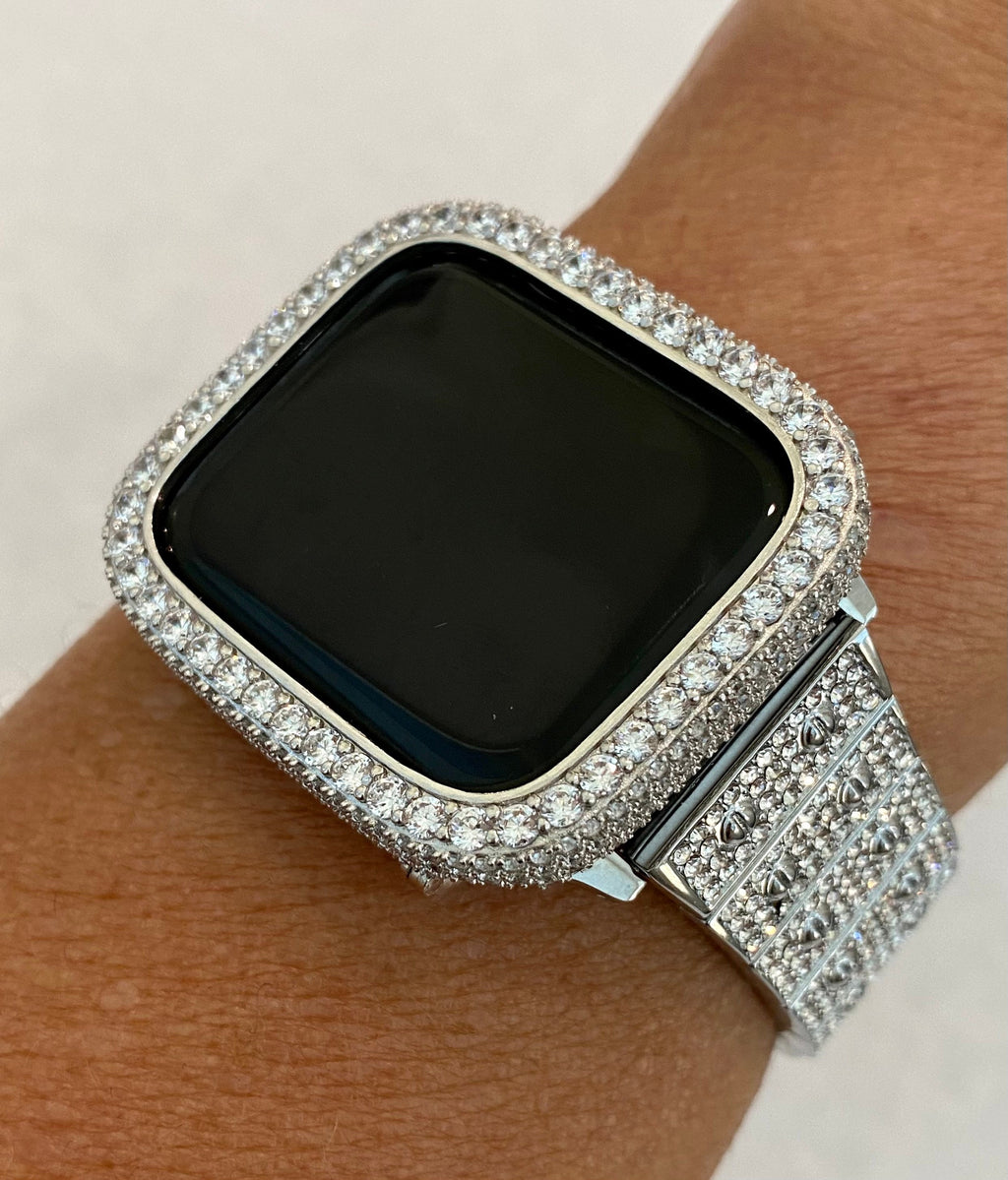 Fits the Apple Watch available for sizes 38mm 40mm 41mm 42mm 44mm 45mm 46mm Series 2-11 SE Ultra 1/2/3 Men's & Women's. This is a custom Iwatch Candy Apple Watch Band set with High End Swarovski Crystals in a luxury Silver Alloy Metal for extra shine and durability The sparkle on this band is amazing. Can be adjusted to fit wrist sizes from 5.5" to 7.25". Easy to resize and comes with a tool/instructions. You can select the set band+bezel, band only or bezel cover only using the drop down menus.