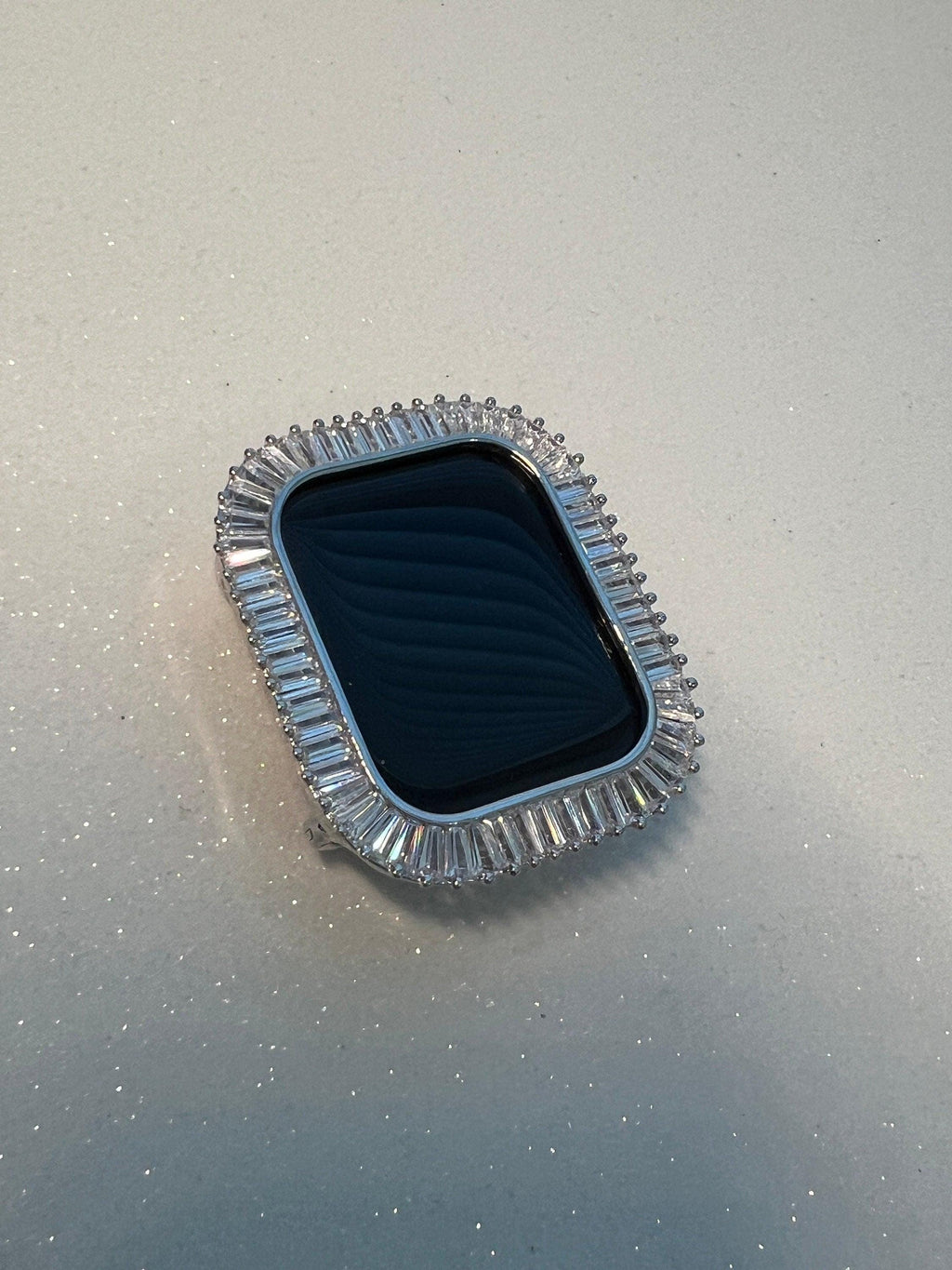 Complete your holiday party look with the stunning silver Apple Watch case. The case is adorned with large baguette lab diamonds in 14k white gold Plated Metal, guaranteeing long-lasting wear and shine. It features two bars on the back to secure the case, with one that opens for easy placement of the watch. Please note that this case is not compatible with the all ceramic Apple Watch.