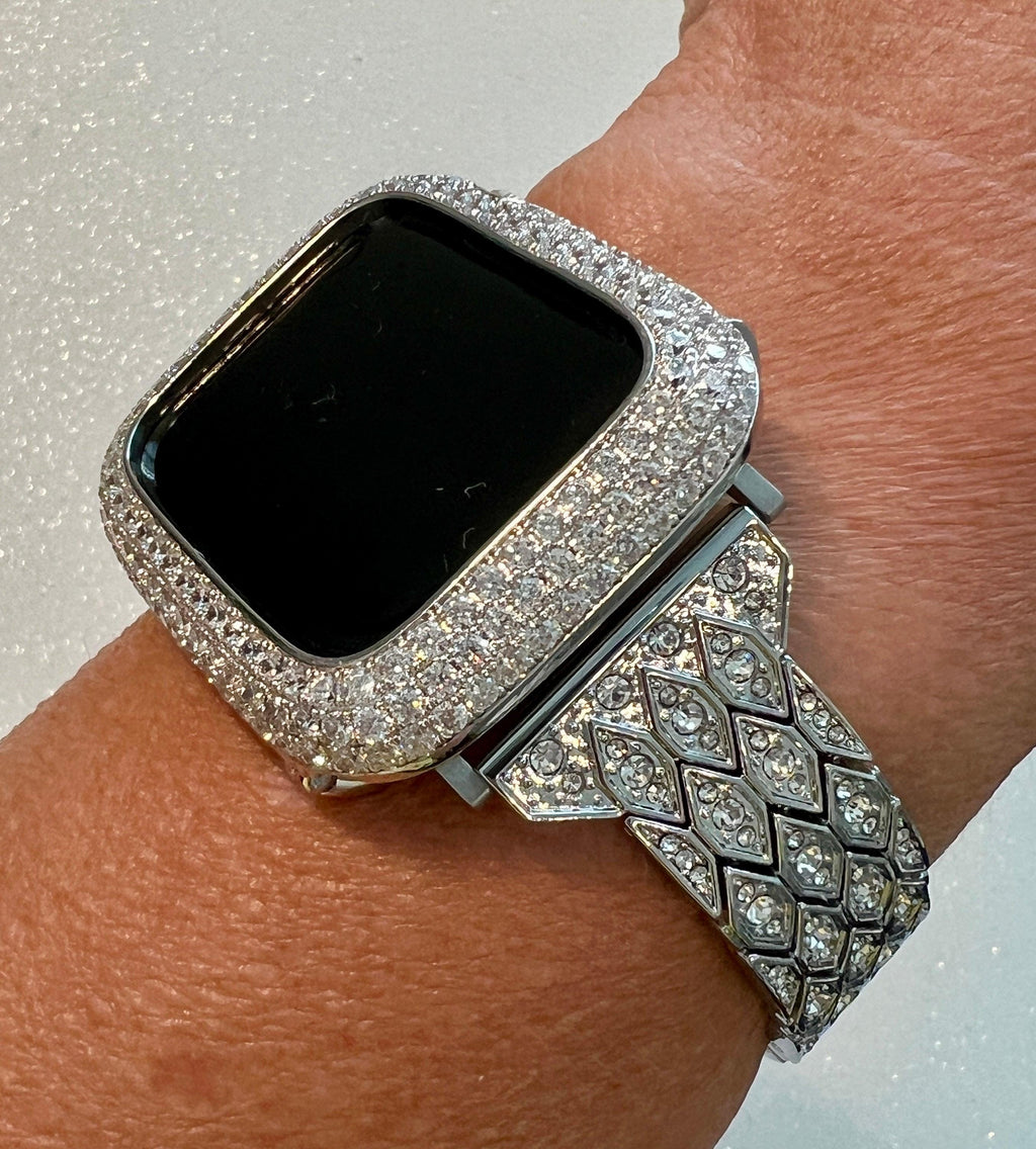 Apple Watch Case Materials: 14kt White gold plating over a metal base with hand set pave lab created diamonds. Two bars on the back hold the Apple Watch in place with access to all buttons. There is NO screen protector. Instructions Included.