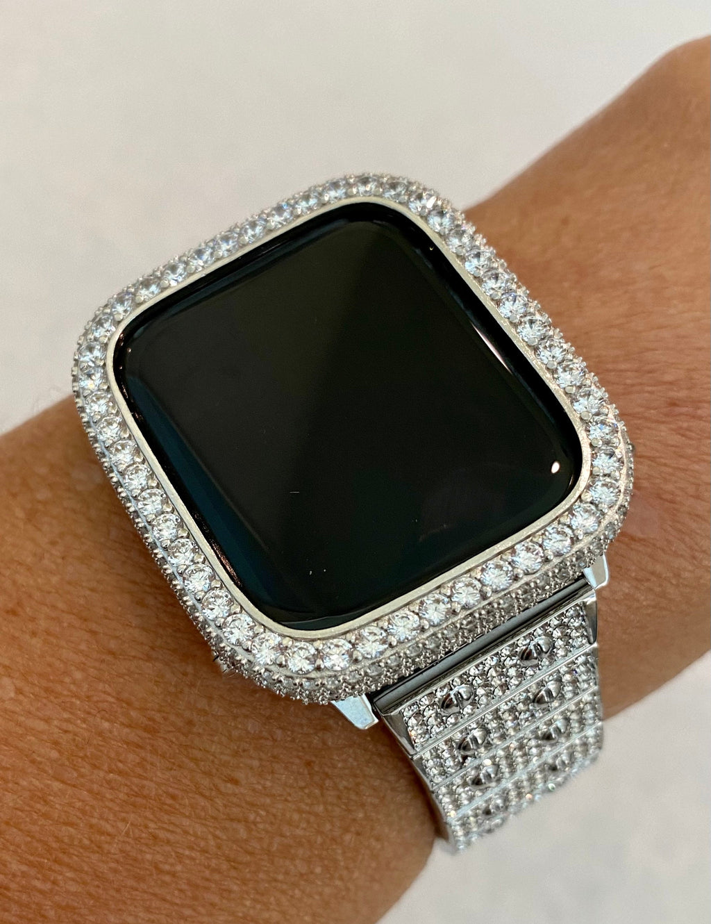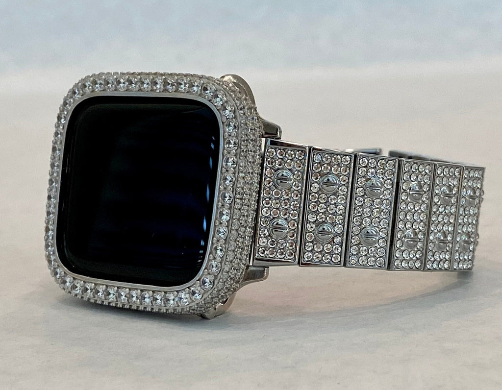 Fits Apple Watch in sizes 38mm 40mm 41mm 42mm 44mm 45mm 46mm Series 2-11 SE. 49mm Ultra 1/2/3 This is a custom Iwatch Candy Silver Apple Watch Band set with High End Swarovski Crystals in a luxury silver Alloy Metal for extra shine and durability. The sparkle on this band is amazing. Can be adjusted to fit wrist sizes from 5.5" to 7.25". Easy to resize and comes with a tool/instructions. You can select the set band+bezel, band only or bezel cover only using the drop down menus.