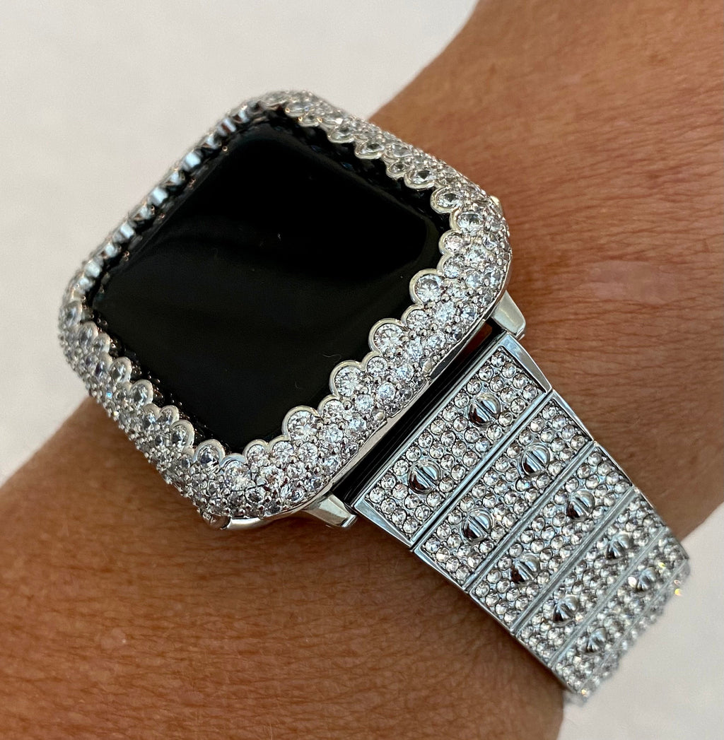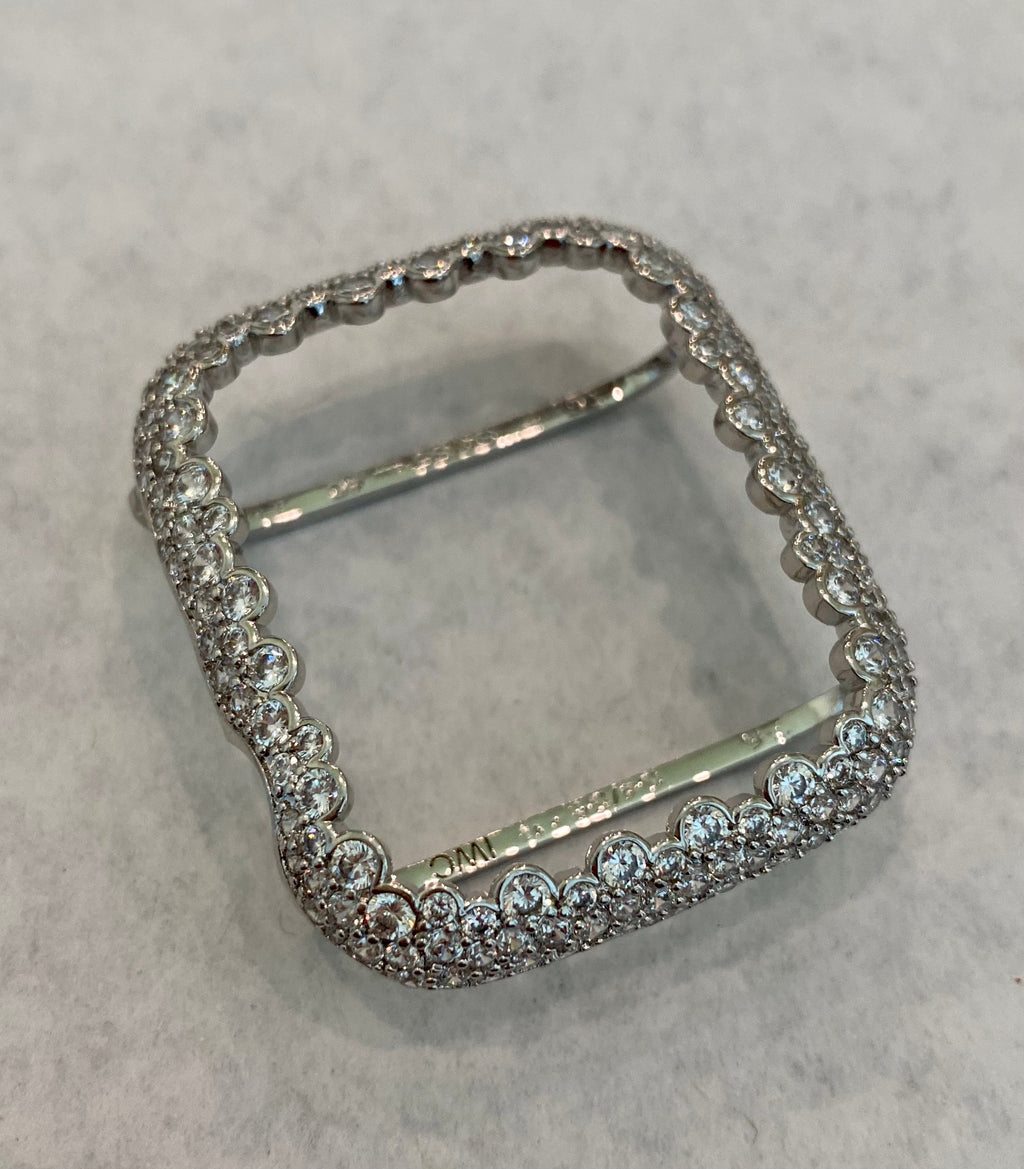 Apple Watch Case Materials: 14kt White gold plating over a metal base with hand set pave lab created diamonds. Two bars on the back hold the Apple Watch in place with access to all buttons. There is NO screen protector. Instructions Included.