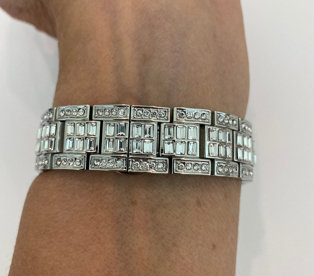 Made with high-quality materials, this band is not a brand copy but a custom design exclusively by Iwatch Candy. It features rows of sparkling Baguettes and pave crystals on a slim silver stainless steel band, giving it a stunning and luxurious look. For added sparkle, you can also opt to add the 14k White Gold Plated pave lab diamond bezel.