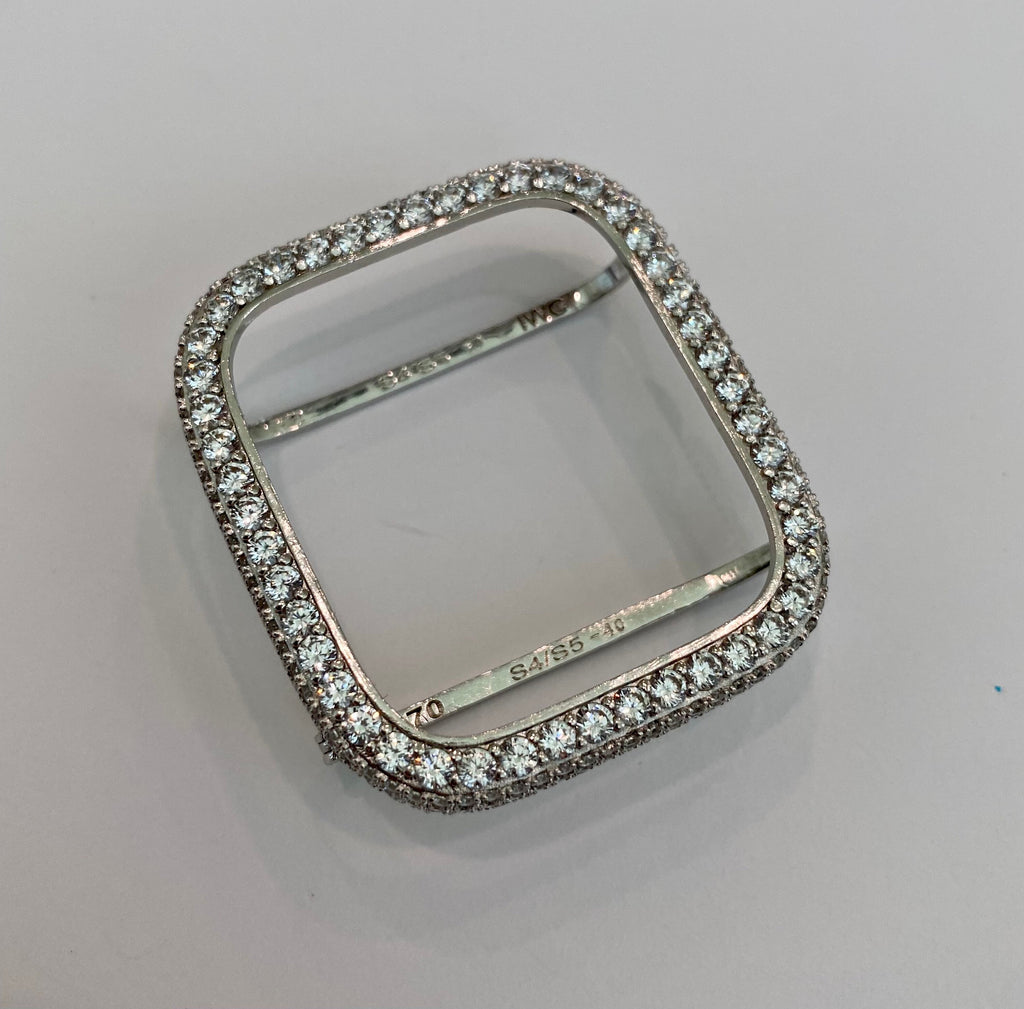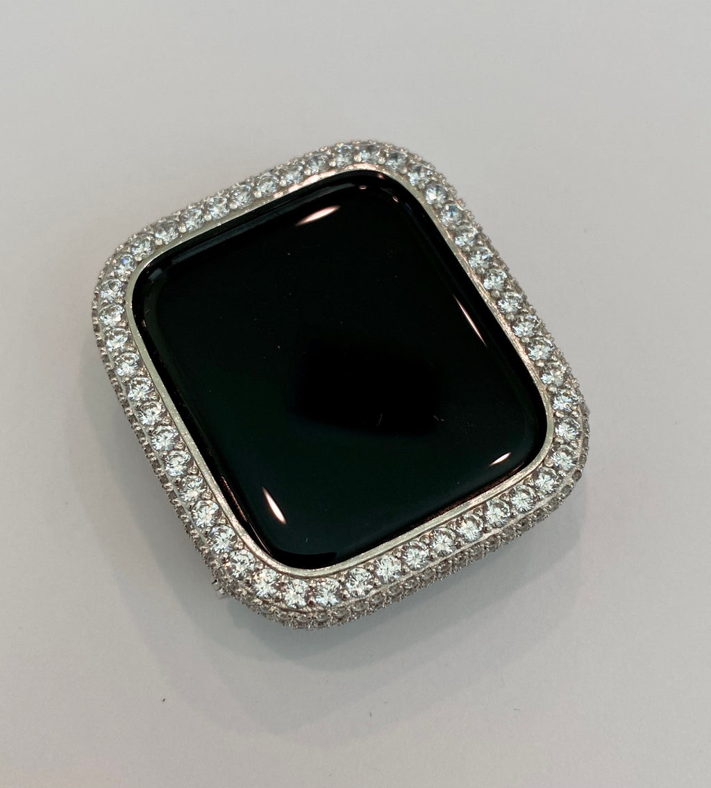 Please note that this product listing has multiple purchase options at checkout. We also offer a 14k white gold plated metal case cover bezel, hand-set with 2.5mm lab diamonds on the top and micro pave lab diamonds on the sides. This cover has two bars on the back to securely hold the watch in place, with full access to all buttons. Please note that the Apple Watch shown in the photos is not included and is only used for a photo shoot.