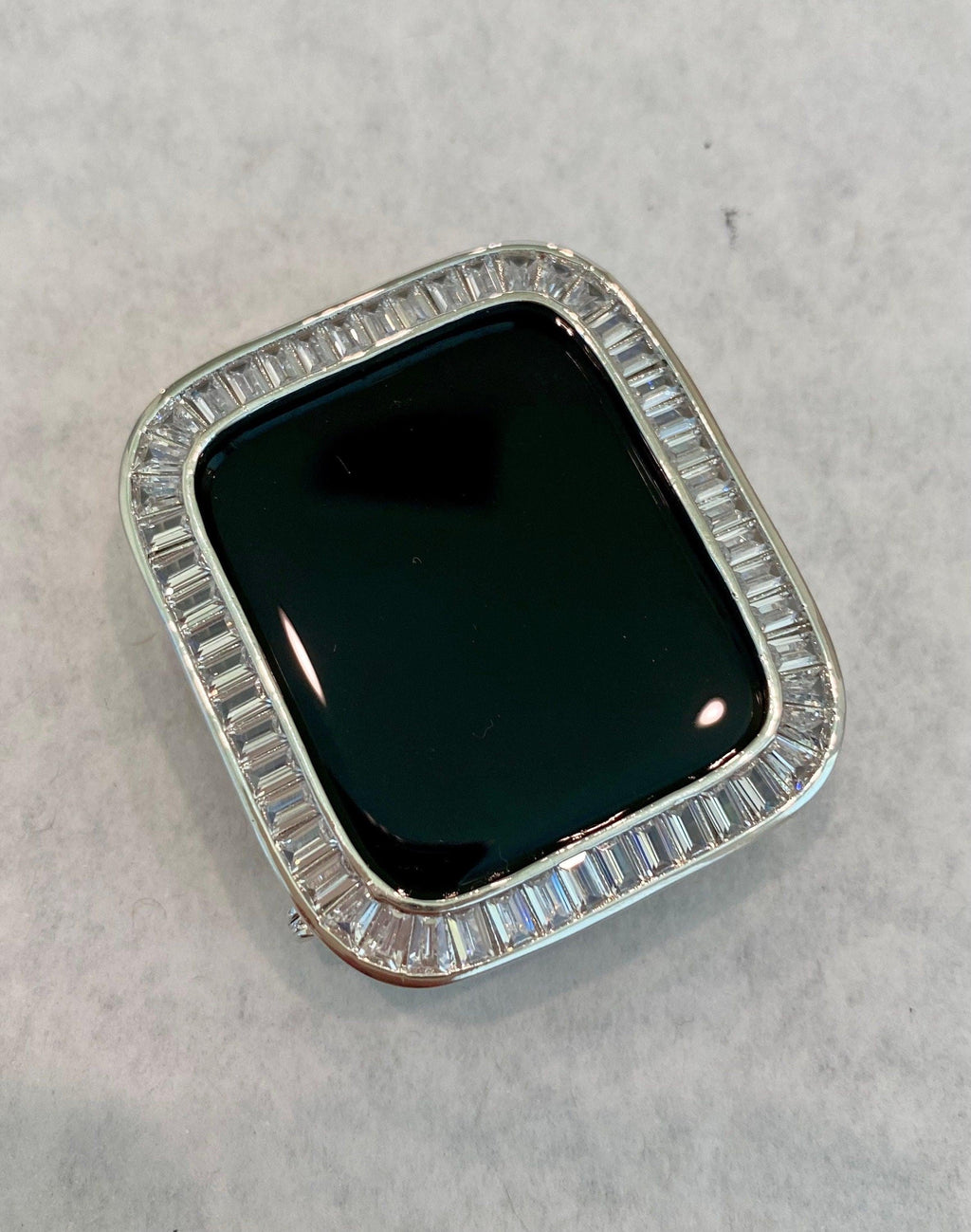 Our Circle Link Apple Watch Band comes with three options: the band only, band + bezel set, or bezel cover only. You can simply select your preferred option from the drop-down menus. For an extra touch of elegance, you can also add a 14k white gold plated metal Apple Watch case with hand-set large baguette lab diamonds. This case features two bars on the back to securely hold the watch in place and allows access to all buttons. Please note that this case does not come with a screen protector.
