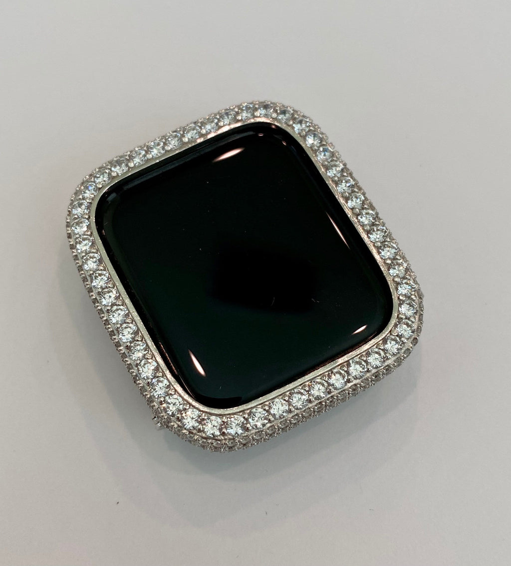 Apple Watch Case Materials: 14kt White gold plating over a metal base with hand set pave lab created diamonds. Two bars on the back hold the Apple Watch in place with access to all buttons. There is NO screen protector. Instructions Included.