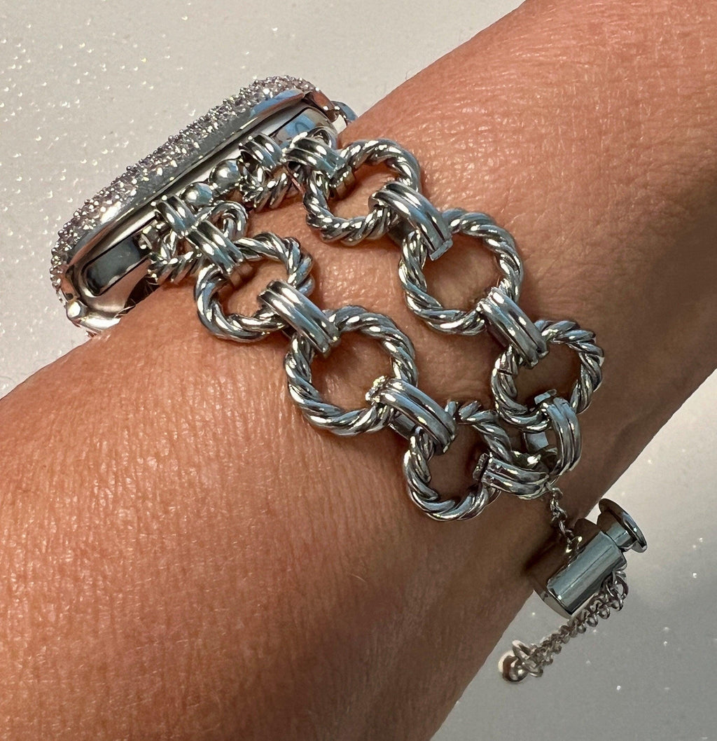 Fits the Apple Watch available for sizes 38mm 40mm 41mm 42mm 44mm 45mm 46mm Series 2-11 SE Ultra 1/2/3 Men's & Women's (see last 2 photos for 49mm design is slightly different due to it's shape). Customize your Apple Watch with this Iphone Watch Band with Round Twisted Oval Links set in silver Stainless Steel. The band has a toggle chain closure. Can be adjusted to fit wrist sizes from 5.75" to 8". Please measure your wrist before purchasing to ensure it's a good fit.