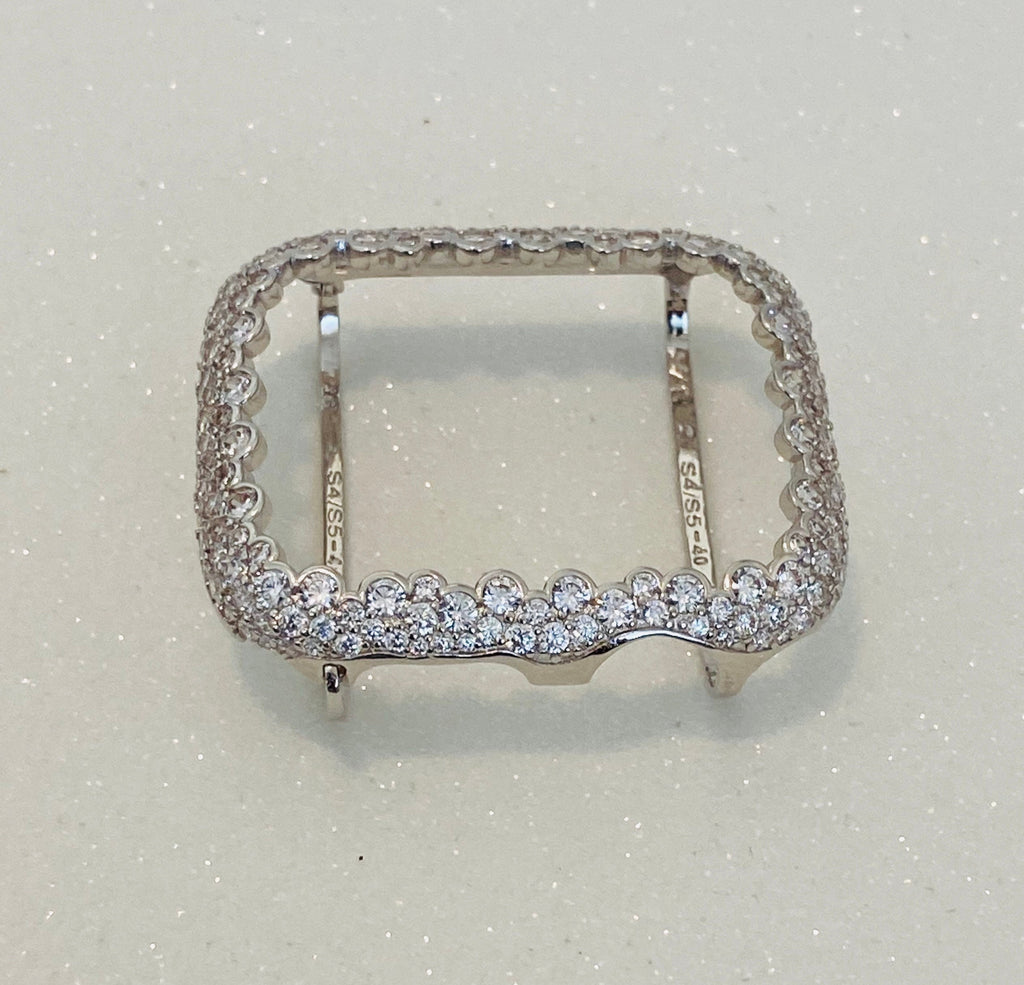 Made with 14k white gold plated metal, this bezel cover features hand-set large lab diamonds around the face and micro pave lab diamonds on the sides, giving it a luxurious and elegant look. Perfect for both men and women, this custom Apple Watch case is a great gift for any occasion.