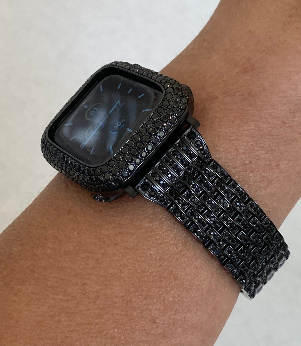 Fits Apple Watch in sizes 38mm 40mm 42mm 41mm 44mm 45mm 46mm Series 2-11 SE. 49mm Ultra 1/2/3. This beautiful Black Apple watch band is high on the bling with a stainless steel band that features rows of high quality High End Swarovski Crystals. Add the matching Apple Watch Case for an over the top Holiday Party Accessory.
