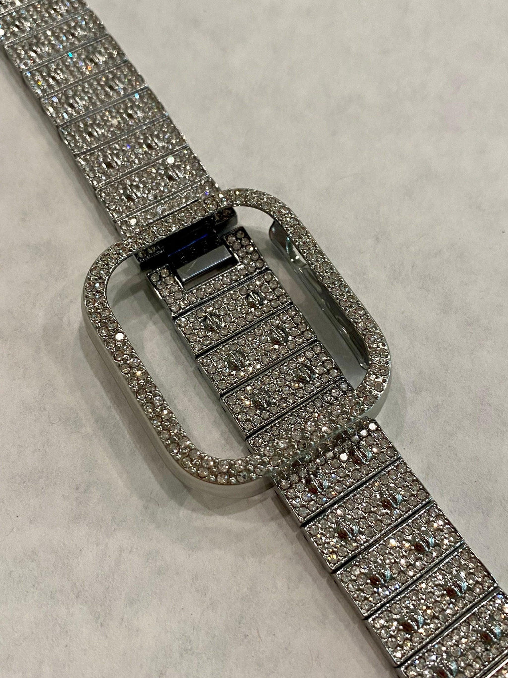 Fits the Apple Watch Sizes 38mm 40mm 41mm 42mm 44mm 45mm 46mm 49mm Ultra 1/2/3 Series 2-11 SE. This is a custom Iwatch Candy Apple Watch Band in Silver set with High End Swarovski Crystals in a luxury Alloy Metal for extra shine and durability & or Silver Apple Watch Cover with Swarovski Crystal set in a Metallic Poly Carbonate hard frame. The sparkle on this band is amazing. Can be adjusted to fit wrist sizes from 5.5" to 7.25". Easy to resize and comes with a tool/instructions. You can select the set band+bezel, band only or bezel cover only using the drop down menus.