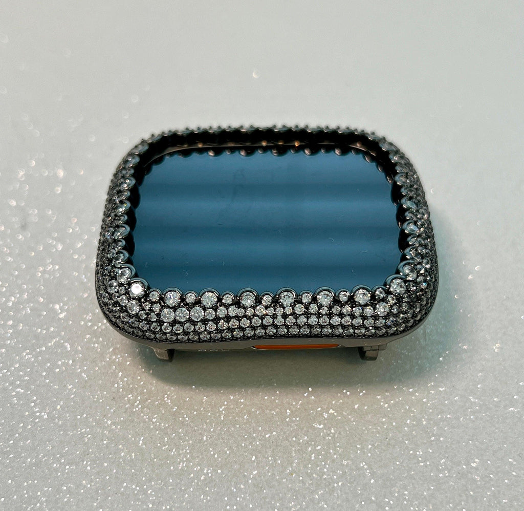 This custom Apple Watch Case Fits the Apple Watch available for sizes 38mm 40mm 41mm 42mm 44mm 45mm 46mm Series 2-11 SE Ultra 1/2/3 Men's & Women's. Black Apple Watch Cover studded in pave lab diamonds, with two bars on the back holding the apple watch in place. One hinged bar on this apple watch cover opens making it each to put on your apple watch. This apple watch case is plated in Black Rhodium with hand set high quality pave lab diamonds.