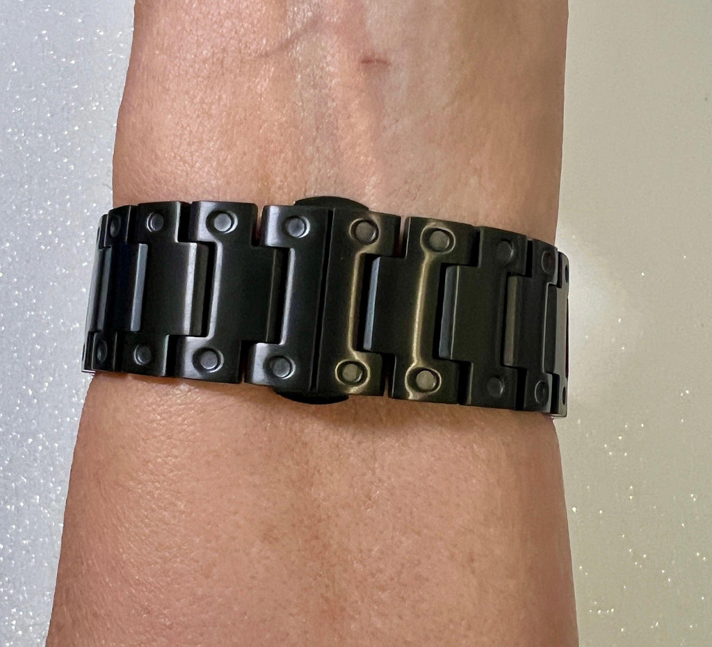 Fits the Apple Watch available for sizes 38mm 40mm 41mm 42mm 44mm 45mm 46mm Series 2-11 SE Ultra 1/2/3 Men's & Women's. Luxury Designer Black Apple Watch Band Stainless Steel with a butterfly buckle. This apple watch band can be adjusted to fit wrist sizes from 5" to 8.5". Easy to resize and comes with a tool/instructions. You can select the set apple watch band+bezel, band only or bezel cover only using the drop down menus.