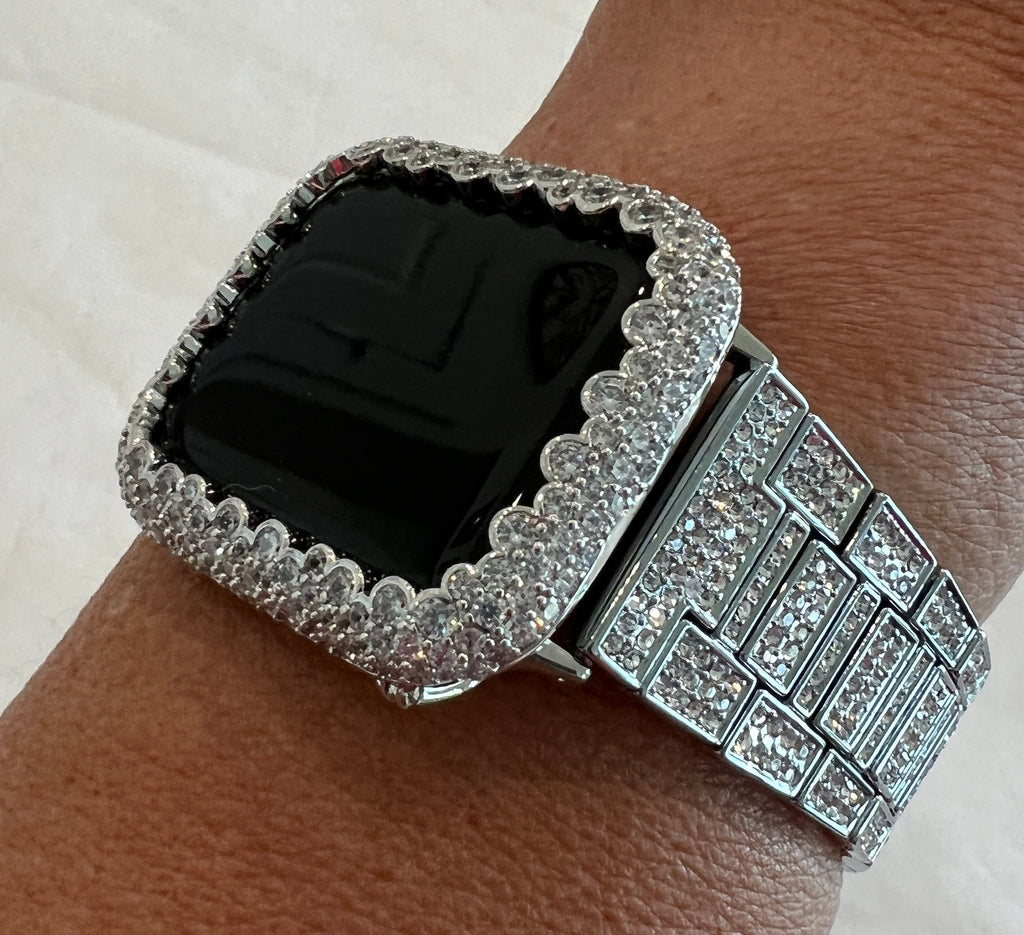 Materials: Swarovski Crystals Apple Band, 14k White Gold Plating Apple Case, Lab Diamonds Apple Case, stainless steel apple band.