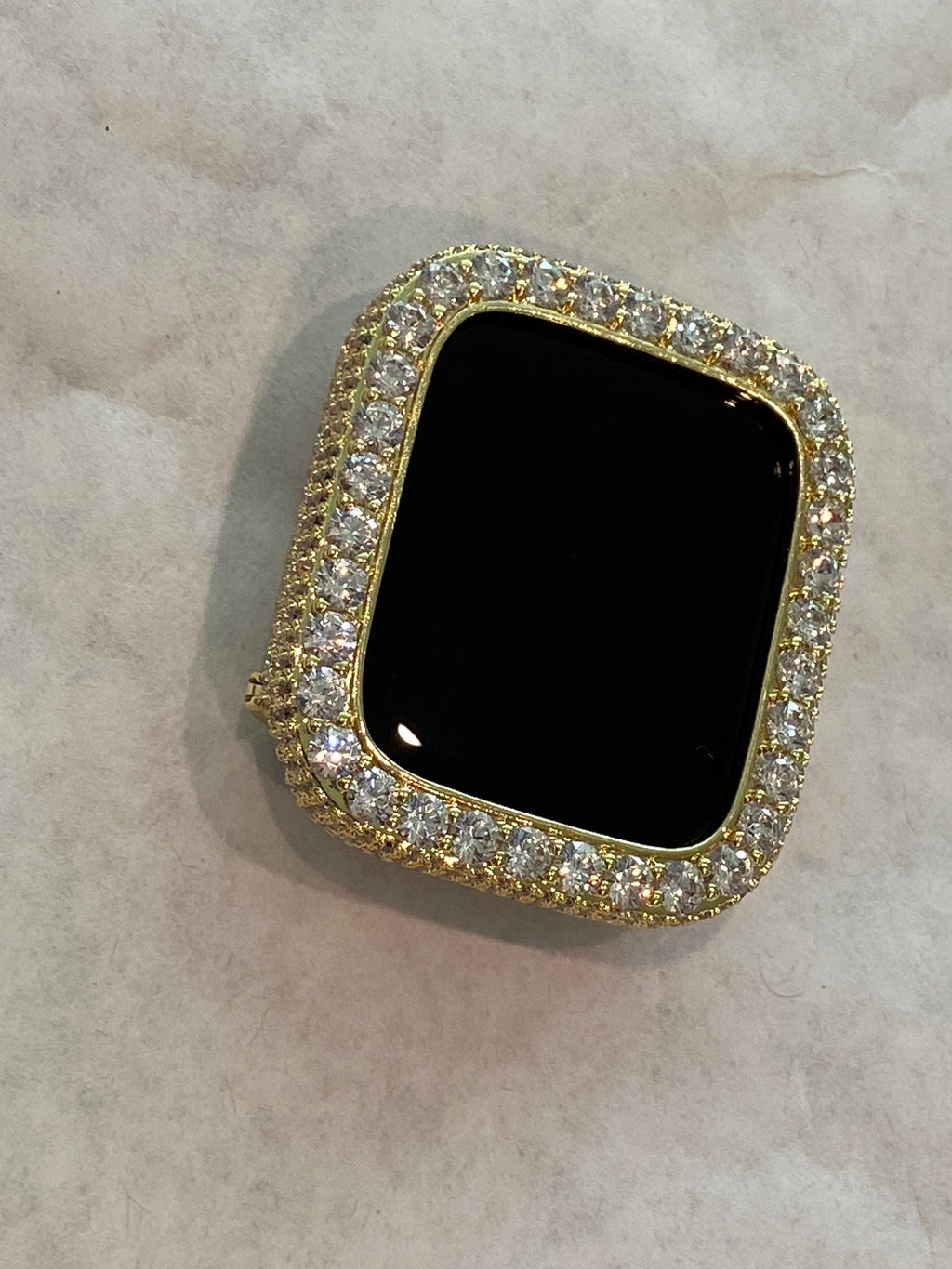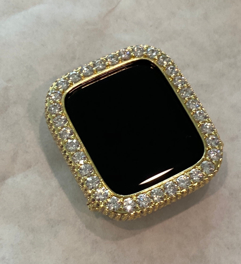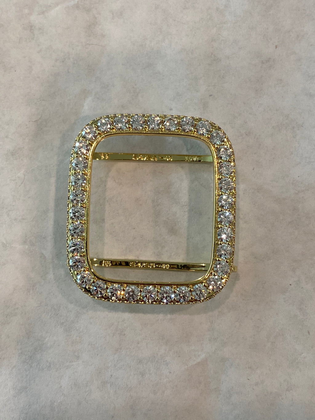 Fits the Apple Watch available for sizes 38mm 40mm 41mm 42mm 44mm 45mm Series 2-9 SE. Men's & Women's. Gold Apple Watch Bezel Cover with Large 3.5mm lab diamonds around the face and micro pave lab diamonds on the sides. Iwatch Case Cover is Metal plated 14k Gold with Huge Sparkle and Bling. Photos just don't do this bezel justice...mega sparkle. Listing is for bezel only, band in photo or video is not included.