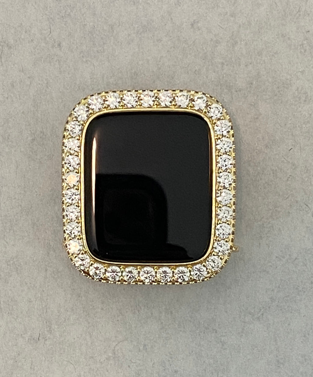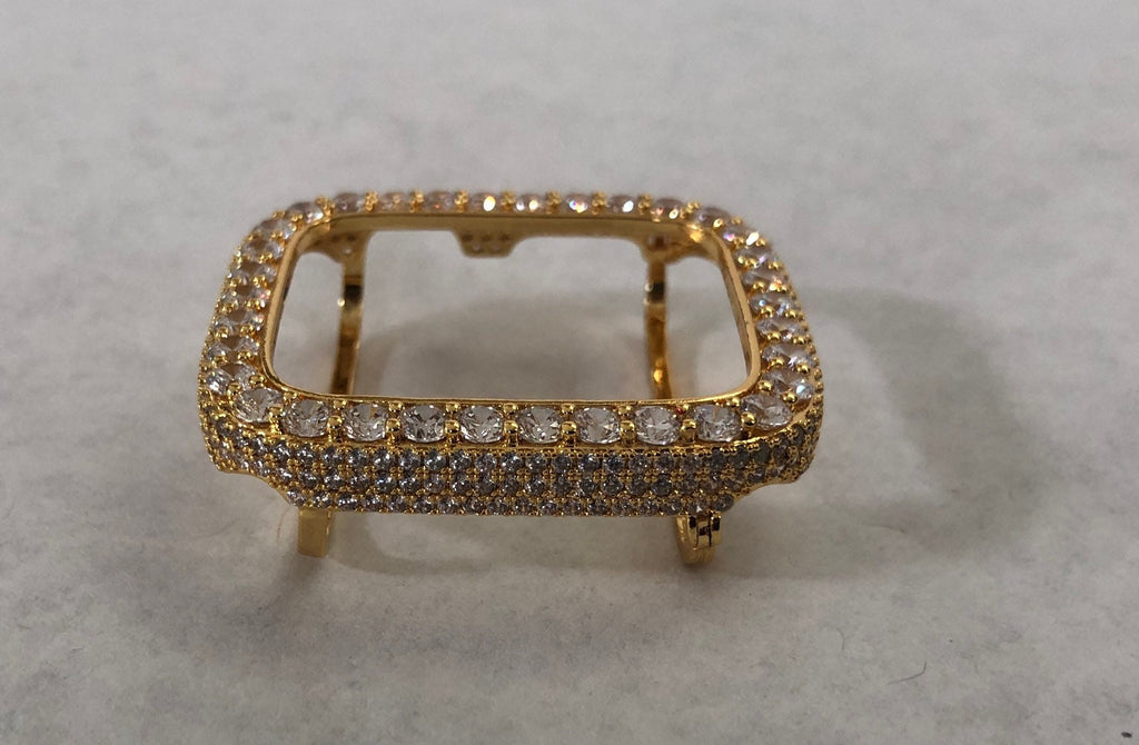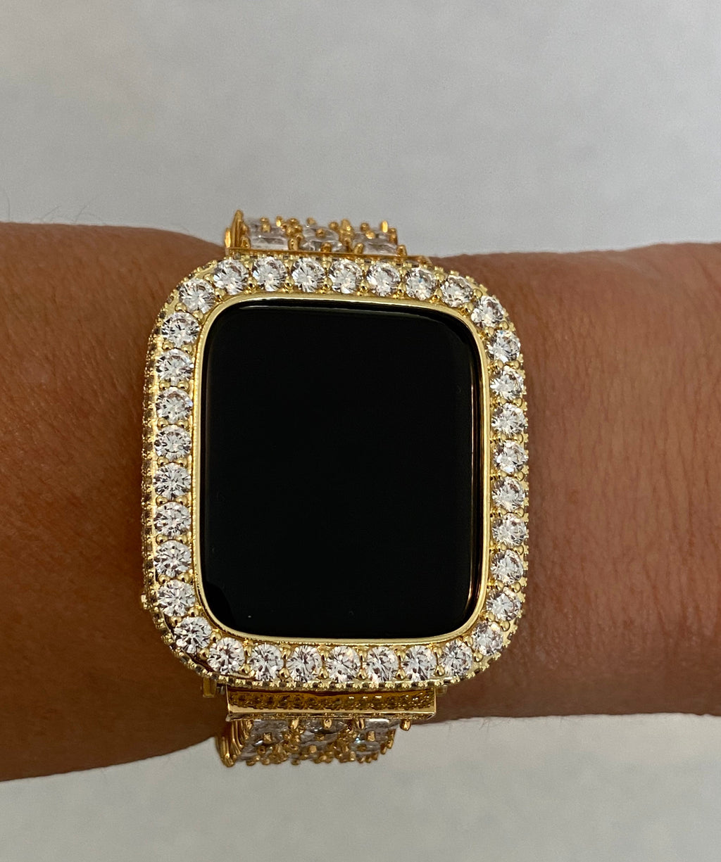 Fits the Apple Watch available for sizes 38mm 40mm 41mm 42mm 44mm 45mm Series 2-9 SE. Men's & Women's. Gold Apple Watch Bezel Cover with Large 3.5mm lab diamonds around the face and micro pave lab diamonds on the sides. Iwatch Case Cover is Metal plated 14k Gold with Huge Sparkle and Bling. Photos just don't do this bezel justice...mega sparkle. Listing is for bezel only, band in photo or video is not included.